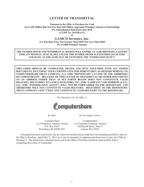 Letter Of Transmittal Gamco Investors Inc Gabelli